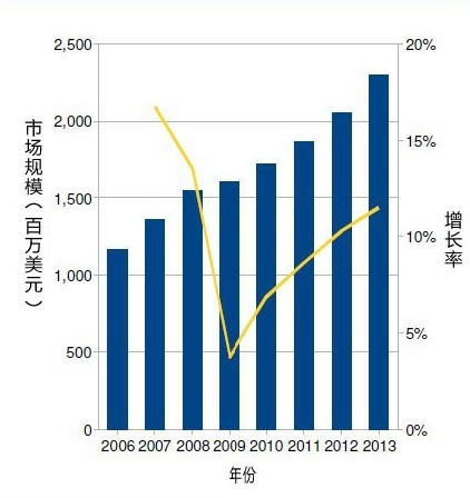 2011年世界監(jiān)控市場價值為290億美元,其中美國占到該市場份額的45%。在美國,估計有1萬至14萬家承包經(jīng)營的安全公司,這些公司非常分散,總體而言利潤不高,2012年收益大約為200億美元。根據(jù)預(yù)測,今后8年內(nèi)遠(yuǎn)程監(jiān)控將以每年5%的速度增長,其中2家公司的收益將占市場的30%,4家公司的收益將占市場的46%。在過去幾年里,由于受到經(jīng)濟衰退的影響,美國一些公司失去了一部分市場份額,制造商們也因為新商業(yè)機會的減少而受害,生意減少了20%至30%。