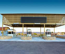 美國BIGEnterprises,Inc公司新開發(fā)了一種雙層的、可應(yīng)對極端天氣情況的崗?fù),主要用于邊境檢查站。該崗?fù)け痪薮蟮膰鷫Νh(huán)繞,在極端天氣情況下檢查過往的卡車或是其他交通工具。警衛(wèi)站在崗?fù)?nèi),可以直接通過目光檢查地面上通過的車輛,而不需要走到崗?fù)ね饷嫒。該設(shè)施具有很強的防彈性能,并配置了多種供電設(shè)施以支持報警、攝像監(jiān)控和其他通信功能。崗?fù)ろ敳垦b有空調(diào)系統(tǒng),同時輔助有備用加熱和地板加熱裝置。